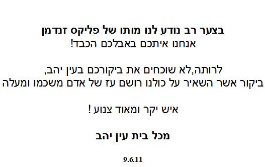 בערב החג כשנודע על מותו של פליקס ירד על עין-יהב אבל כבד כמו הסתלק אחד ממייסדי היישוב. ד"ר פליקס זנדמן היה אדם נדיר בכל קנה מידה. גאונותו המדעית והנשמה היהודית הענקית שלו יהיו לעולם מגדלור של השראה לרבים".