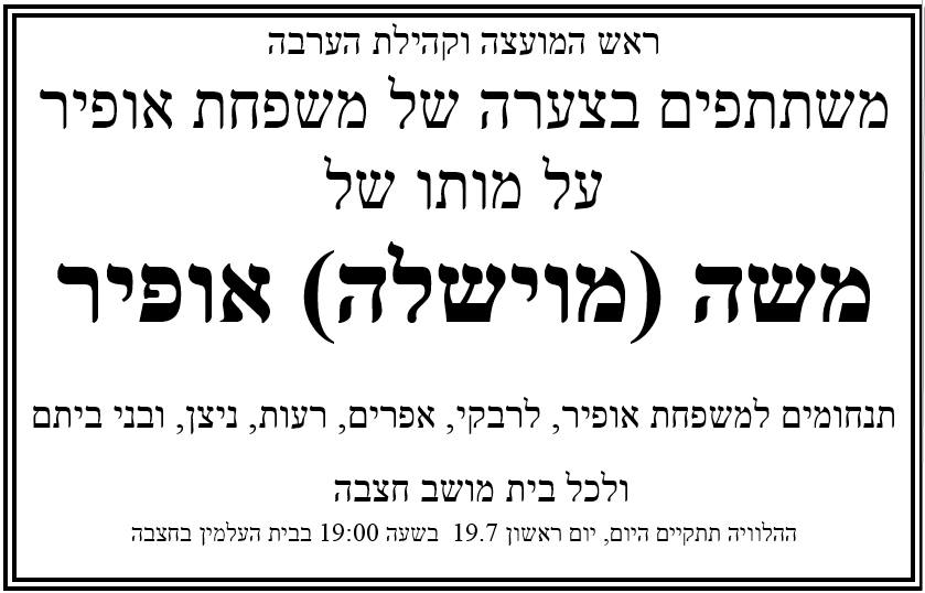 משה (מוישלה) אופיר נולד בי"א אלול תש"ז 27 באוגוסט 1947 בכפר חוגלה.