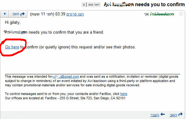 וחוזר עם הודעה, שהכתובת לא ידועה. כלומר, למרות שהמכתב הוא כאילו מחבר, ושמו מצויין במפורש בהודעה - ההודעה לא נשלחה ממנו! אם תלחצו על הקישור, יש סיכוי סביר שישלחו אימיילים דומים לרשימת הכתובות שלכם. לא ידוע לי על נזק נוסף שגורמות ההודעות האלו, אבל לא כדאי לנסות.