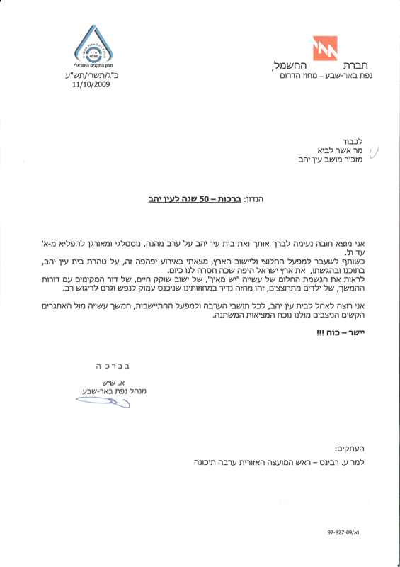 ברכות לחברי מושב עין יהב- 50 שנות בניה ויצירה .